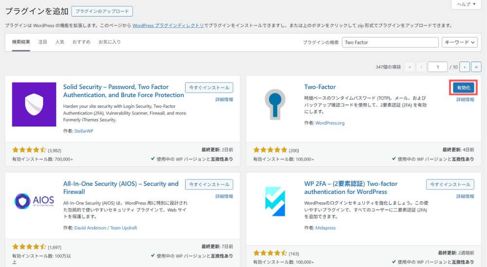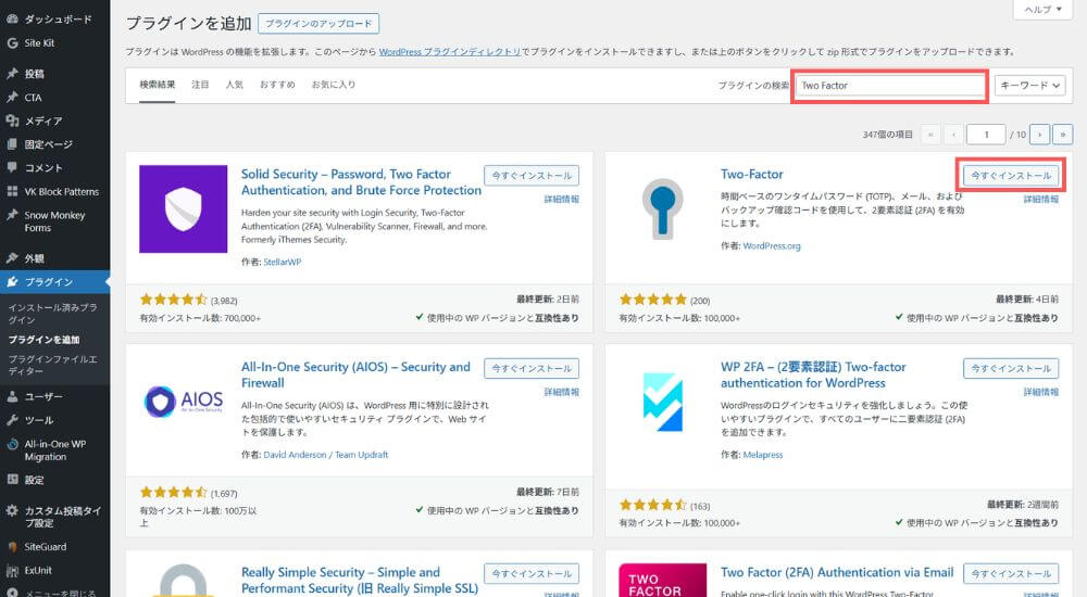「プラグインを追加」から「Two-Factor」で検索し、インストールします。