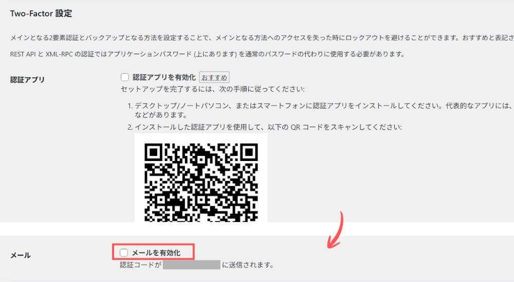 下へスクロールするとTwo-Factor 設定が表示されますので、下の方にある「メールを有効化」にチェックをいれます。